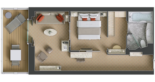 Superior Verandas. Some Veranda Suites accommodate three guests. Teak veranda with patio furniture and floor-to-ceiling glass doors, sitting area, twin beds or queen-sized bed, marbled bathroom with vanity, full-sized bath, separate shower, walk-in wardrobe with personal safe, vanity table with hair dryer, writing desk, two 42” flat-screen HD TVs, interactive Media Library, wall mounted mobile device chargers, direct-dial telephone, one hour of complimentary internet access per guest per day.